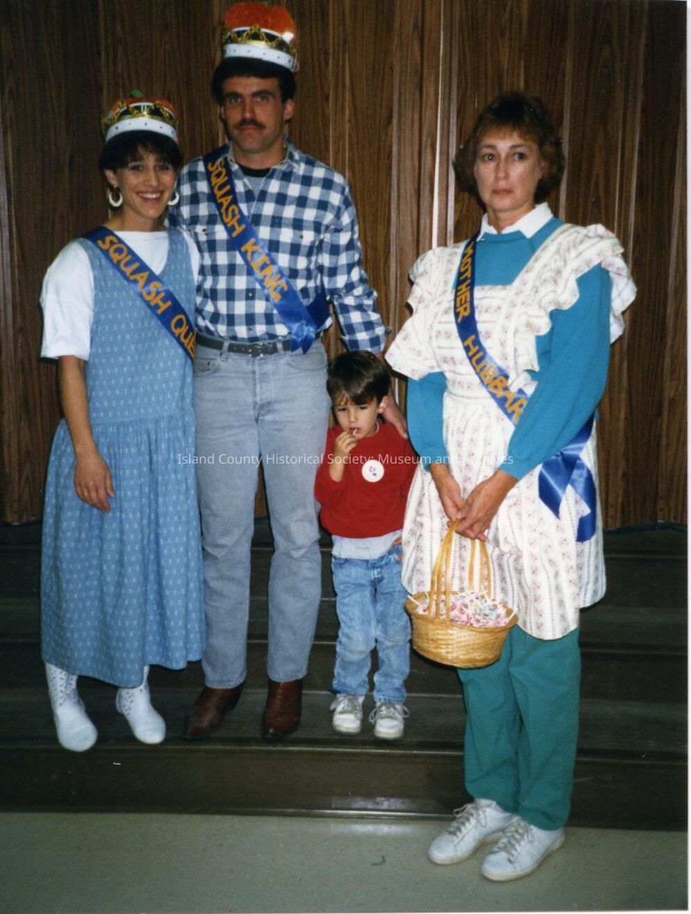 Photo of Harvest Festival. On the back of the photo it states: Debbie, Don , BradleySherman , Ann Weaver 10-88. Three wearing sashes that say Squash Queen, Squash King, and Mother Hubbard.Made/Created