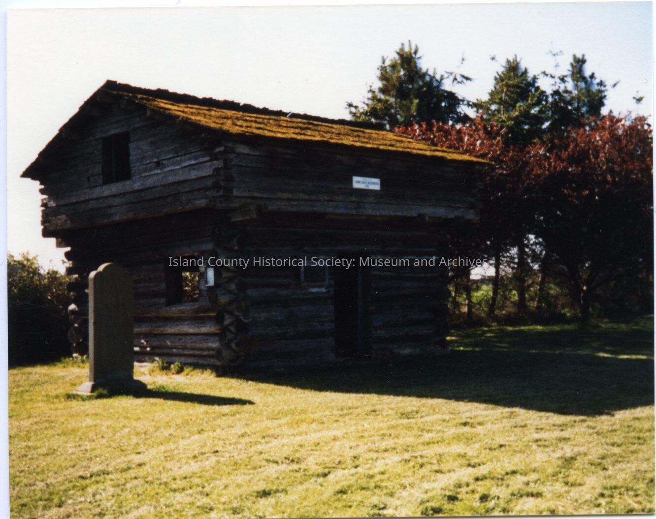Color photograph. Front and side of Davis blockhouse. Door on the right with a small sign on the wall to the left. Another sign over the door: James Davis Blockhouse 1855. A tombstone is to the left. There is a trees in the background.