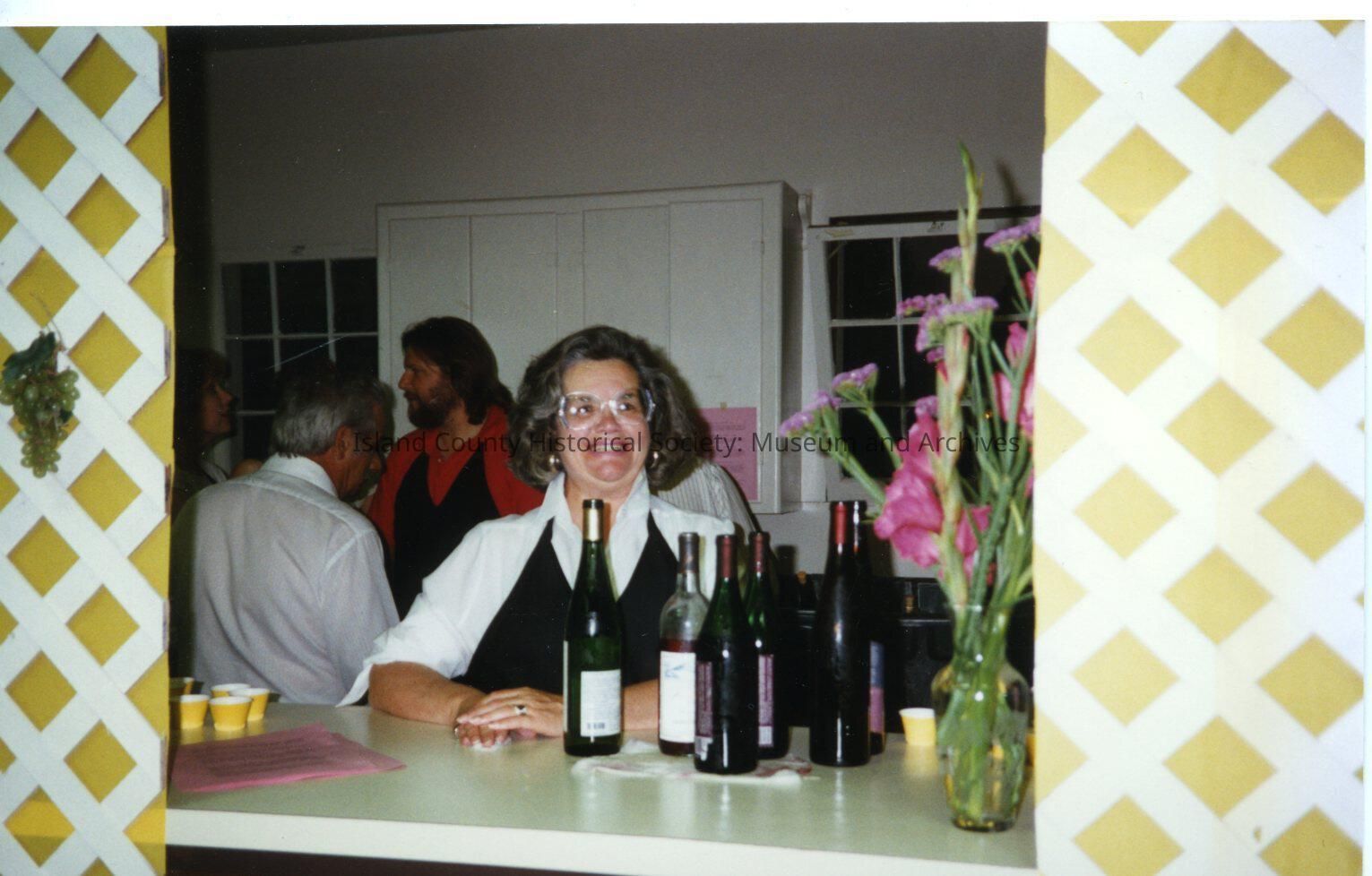 A woman with bottles of wine and vase of flowers on table with other people in the back. Handwritten on back is Sal Rizzo, John Rodriquez and Beuye Weber.