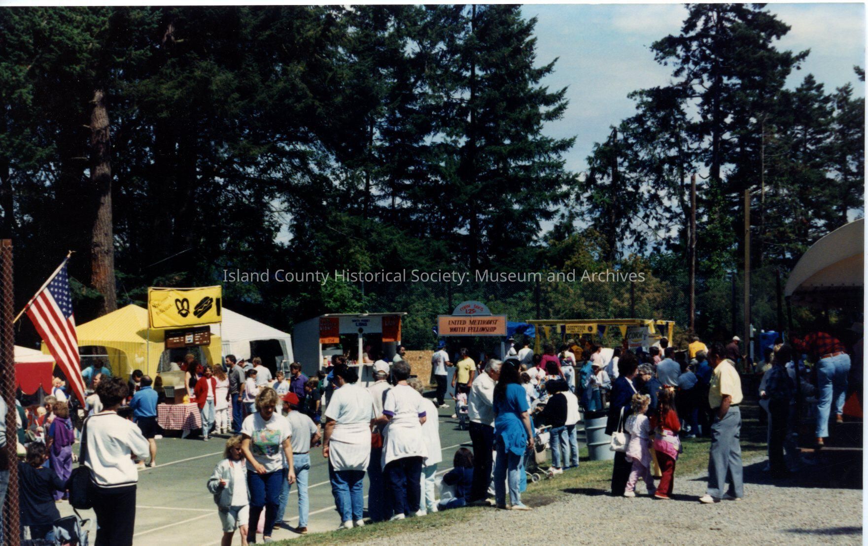 Might be part of Coupeville Arts and Crafts Festival at park. Trees in background. On back is date of 1991.