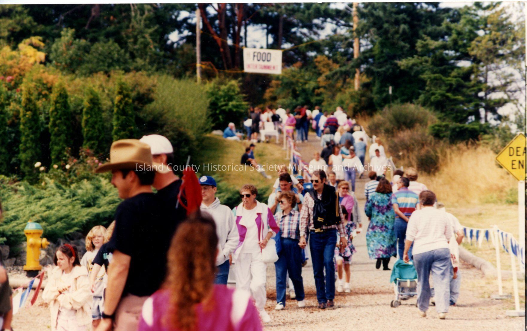 Might be part of Coupeville Arts and Crafts Festival. Shows a crowd of people walking. A sign hangs that says 'Food'. On back is date of 1991.