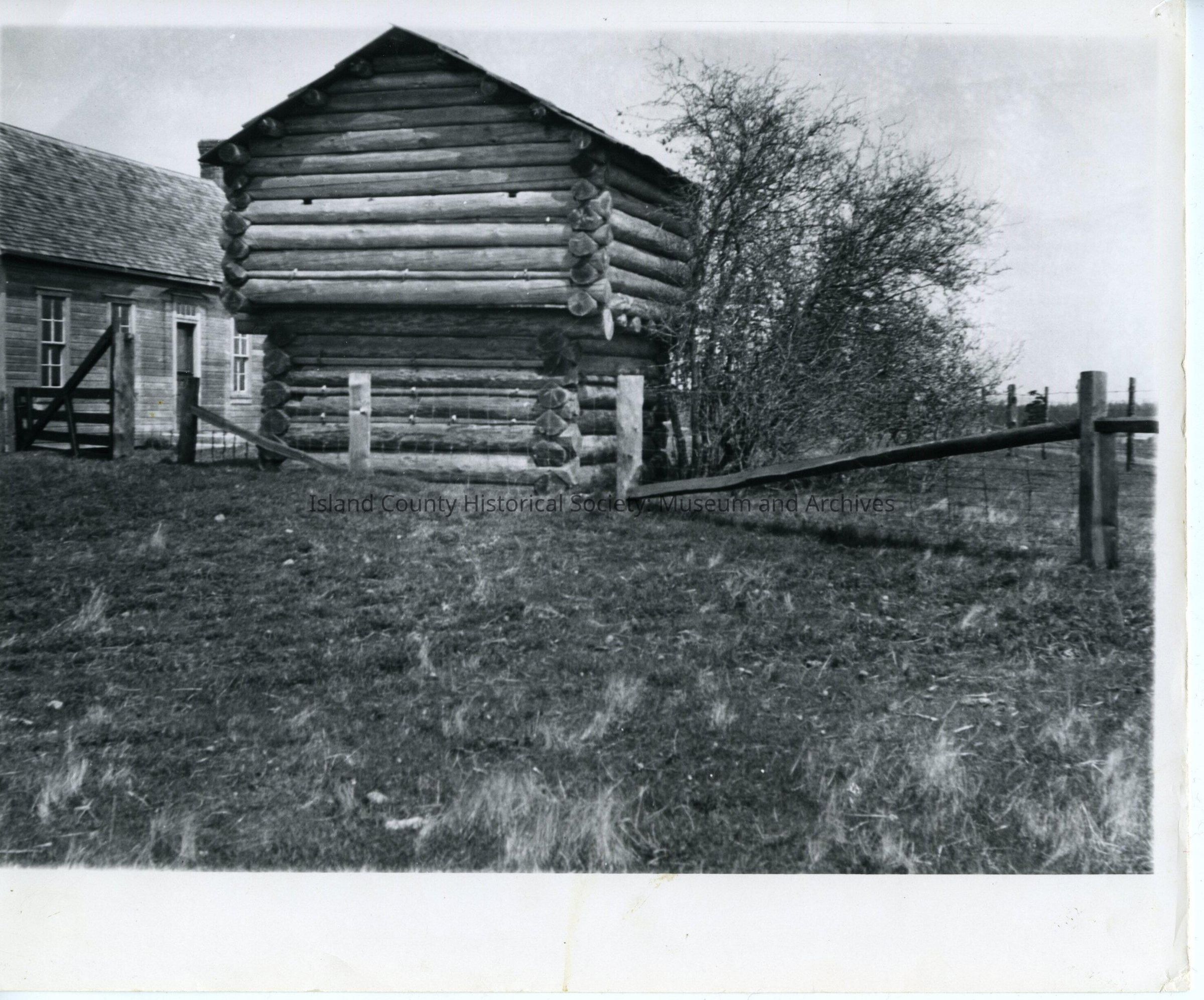 Front and side of Ebey blockhouse with the door facing to the right. To the left of the blockhouse is part of the Ebey house. Part of a brick chimney is visible as well as the one story section. Two rifle holes are visible in the top section. A fence is in front of the blockhouse and behind it.