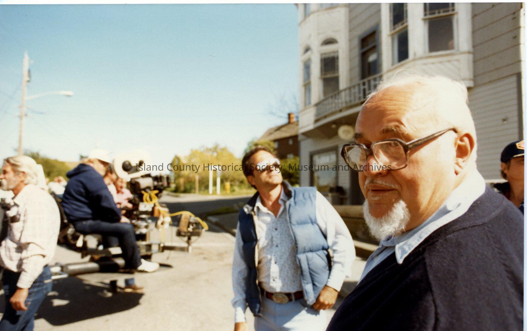 Color photograph of men on Front Street near Glenwood Hotel. Camera in background. Filming of Cry for the Stranger in Coupeville, 1982.
