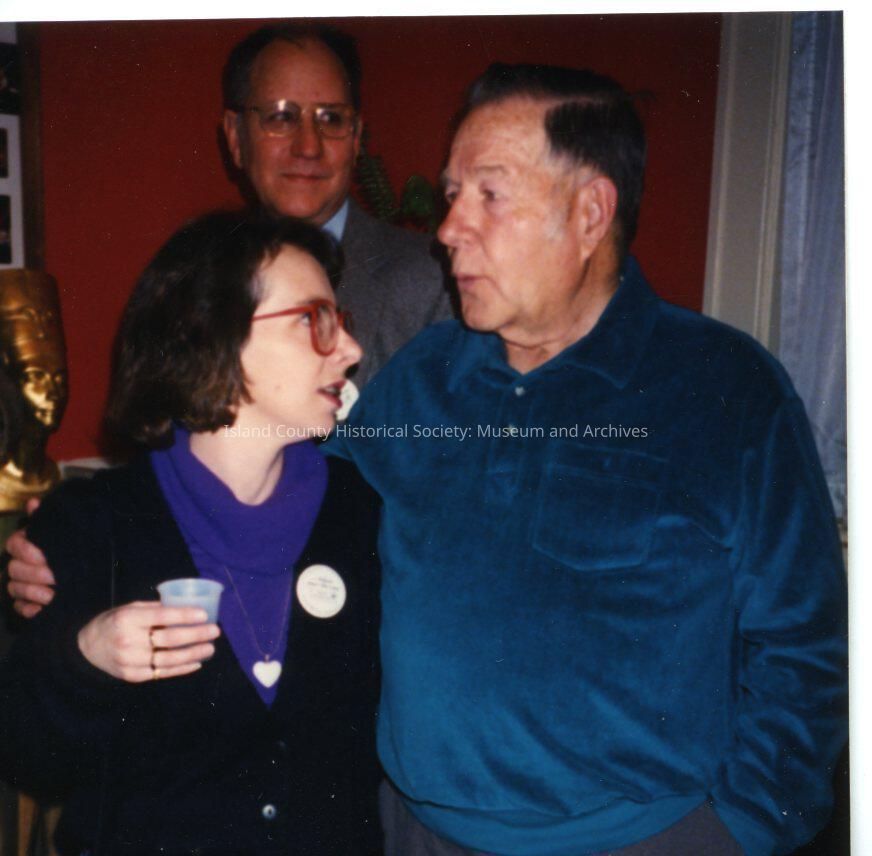 Three people inside building. Handwritten on back Mindy Stone, Don Scoby - Museum Theater.