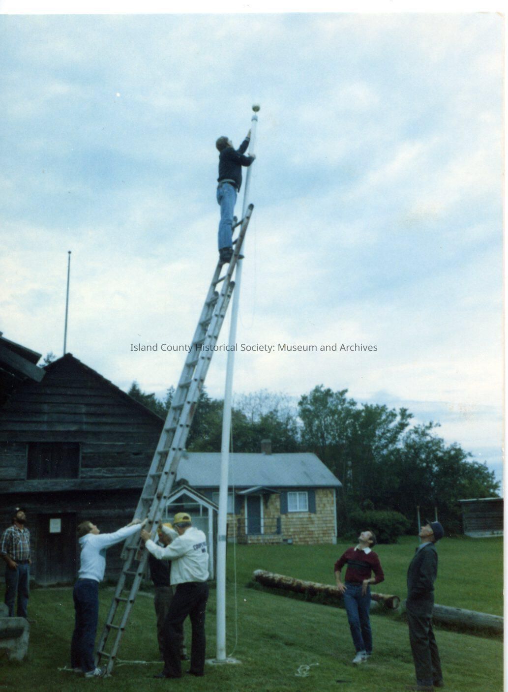 Man on ladder of flag pole with others watching. Handwritten on back says Ron Van Dyk Rethreading Flag Pole.