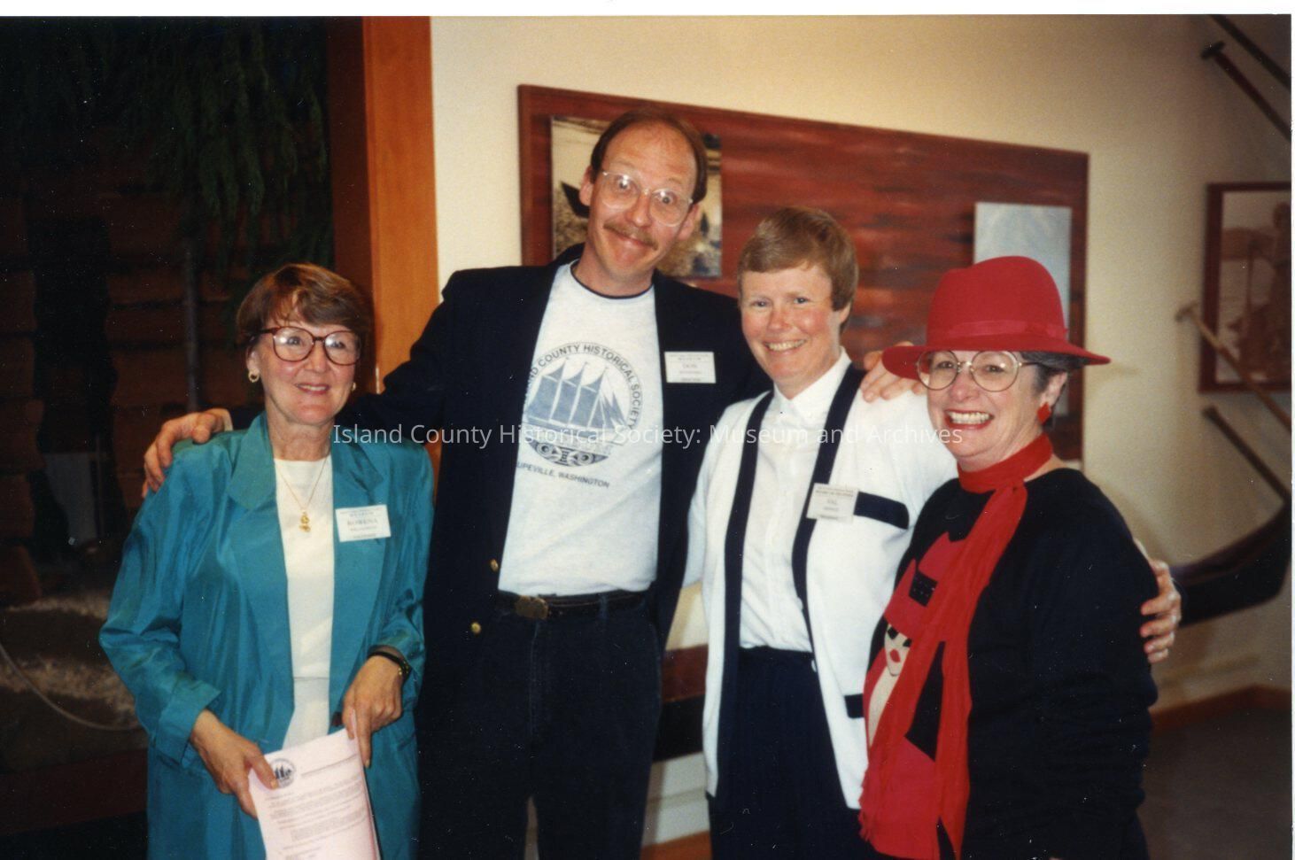Four people in Museum. Handwritten on back is Museum Dedication, Don Wodjenski, Val Arnold, Emily Ramsey.