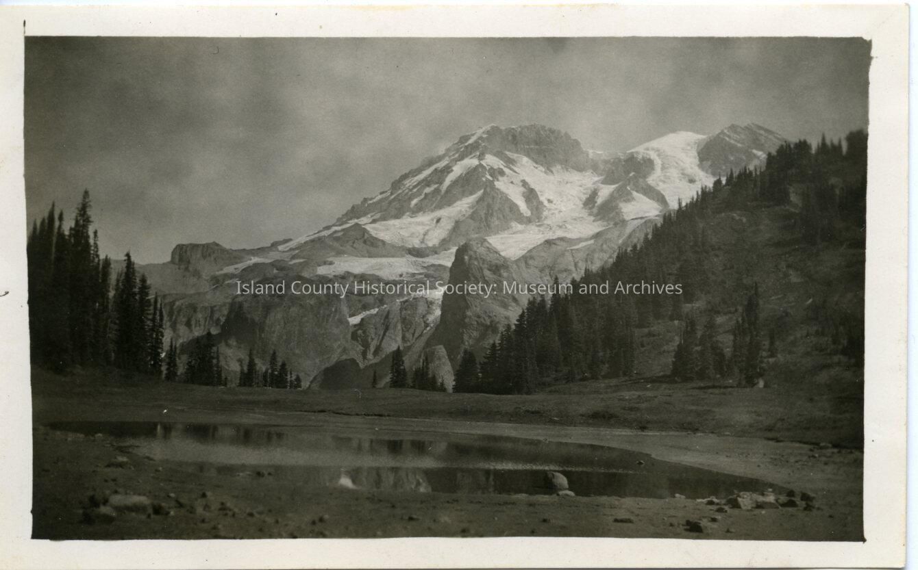 Black and white photo of a mountain scene - with conifer or pine trees in mid view. In the foreground is a pond. The mountains are about half covered in snow. Large oblong boulders are in the mid-range of the photo.