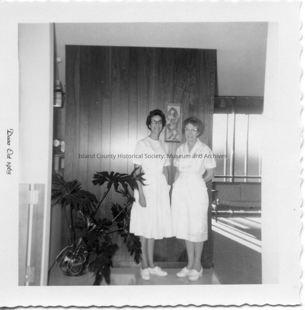 Black and white photo of pals Polly and Helen September 1963. They are wearing white dresses/nurses uniforms, white sensible shoes, and standing beside a large potted plant. Part of a paneled wall is behind them. On the left margin: Daca Oct 1963