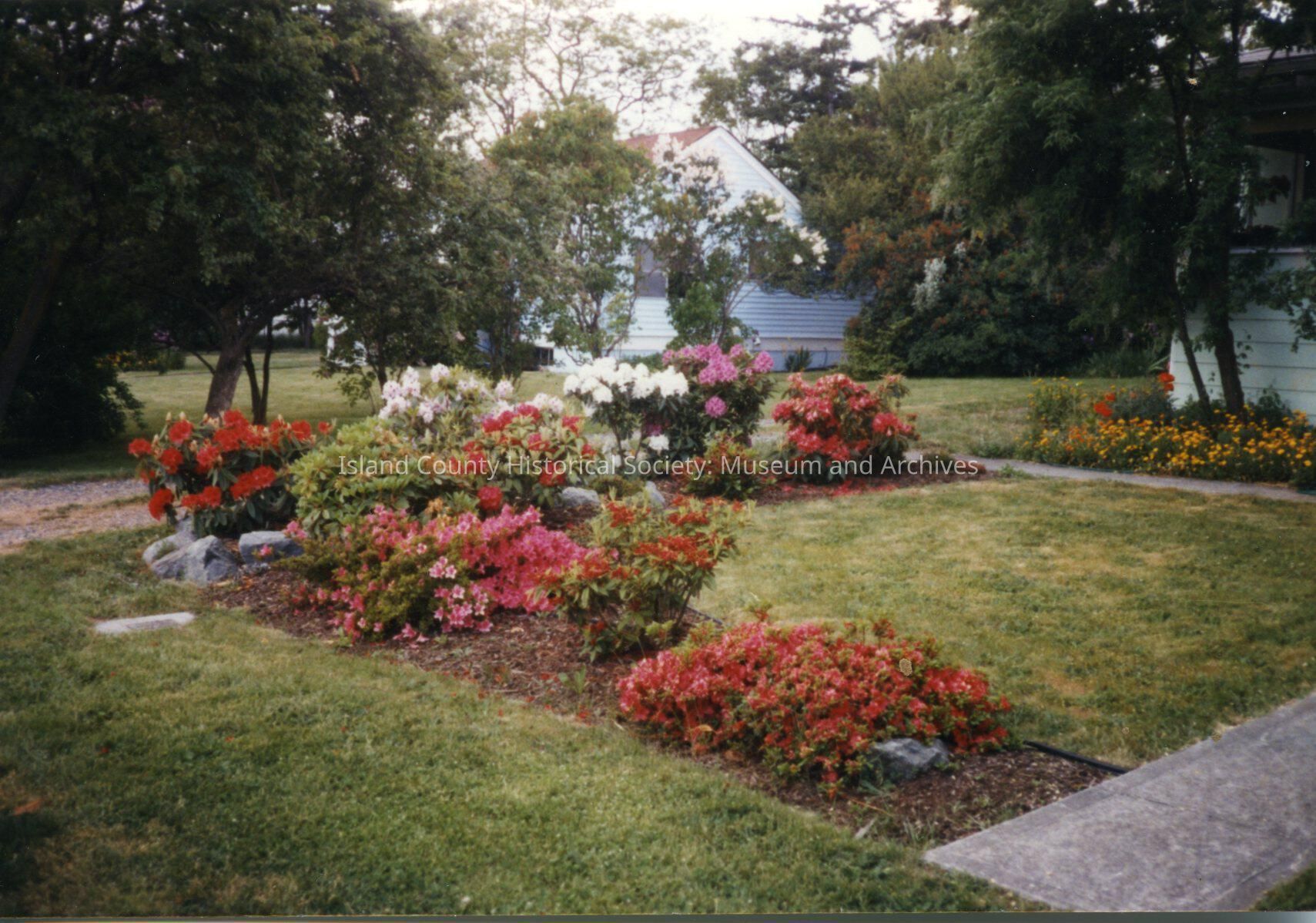 Color photograph of house in the background with flowers and rhododendruns in full bloom. Pink, red and white blossoms. On the back: My "Rhodies" 1997 springtime on "Top o the Hill".