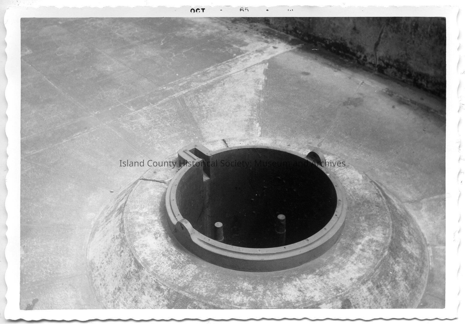 Kodak black and white photograph of Fort Casey gun casing taken in October of 1965.