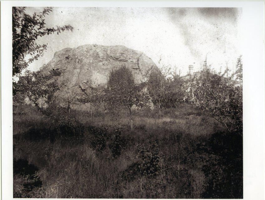 Photo of the big rock on South Main Street. A house is barely visible on the right. It is one story, chimney, decorative railing at the peak of the roof. On the back: From album 83-06-77, Big Rock C'ville