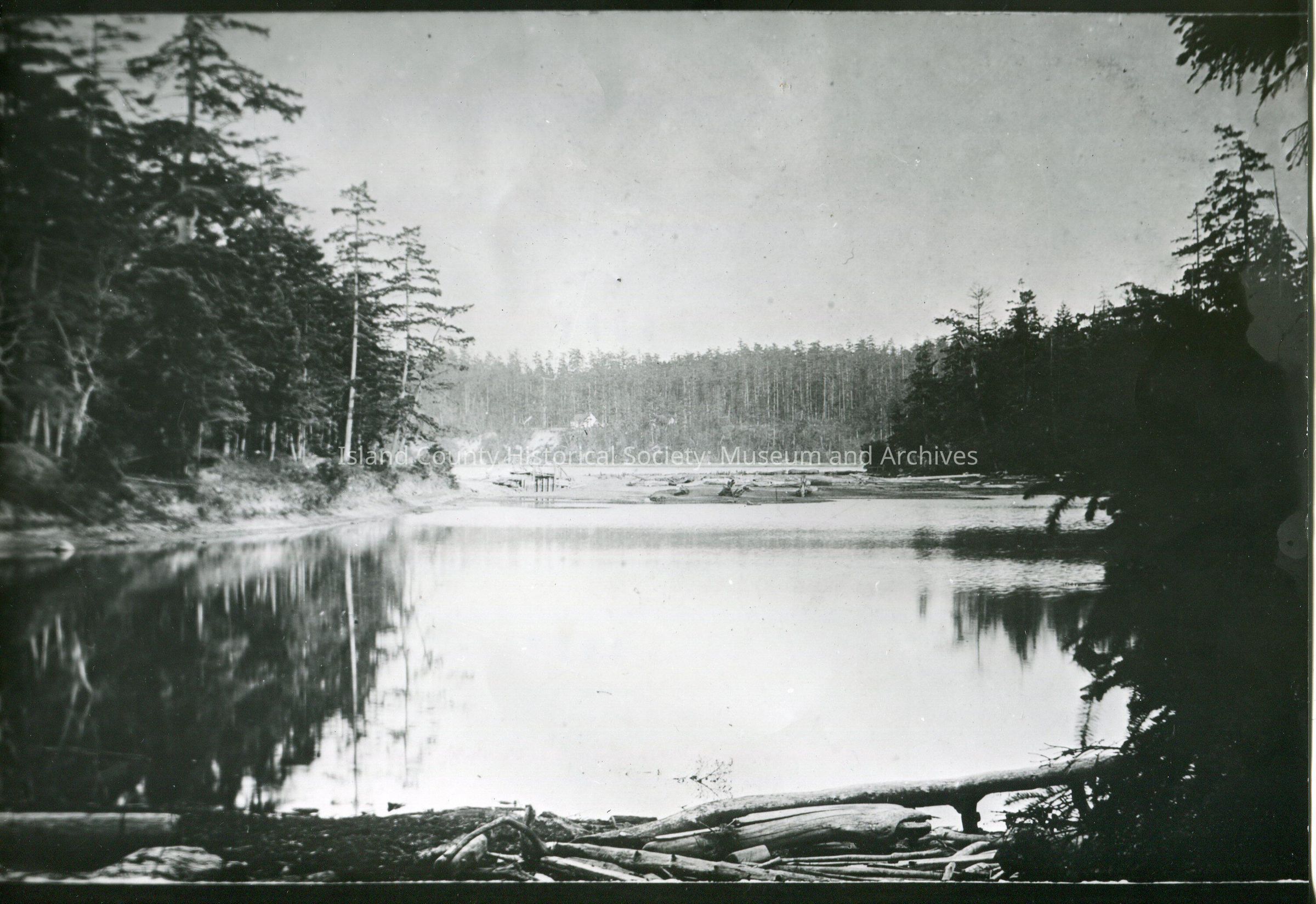 An 8x10 black and white copy photo of a Lagoon in "Still's Park". A stamp on the back of the photo states: The Little Gallery 1112 West Pioneer Way Oak Harbor, Washington 98277 Telephone 206/675-5135.