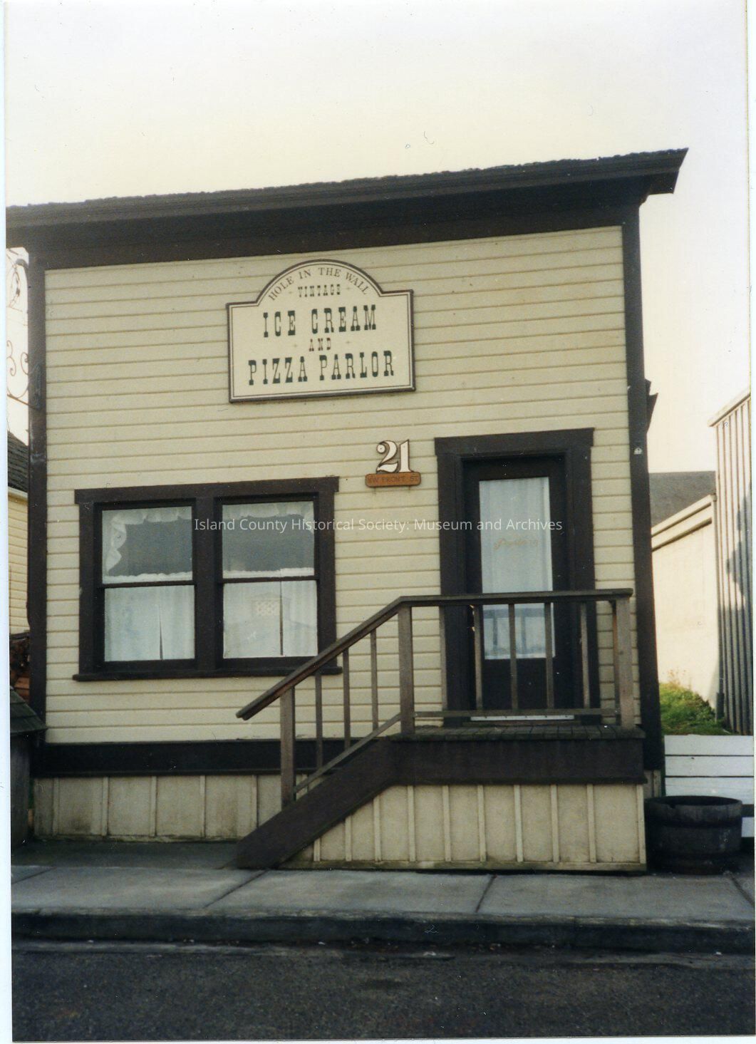 Photo of the building at 21 NW Front Street. The building was moved here from further east on Front Street. Number of businesses, and the abstract office. In 1982 the building was raised three feet and a concrete foundation pured; steps added then. On the back: Island County Abstract Office, Ice Cream shop.