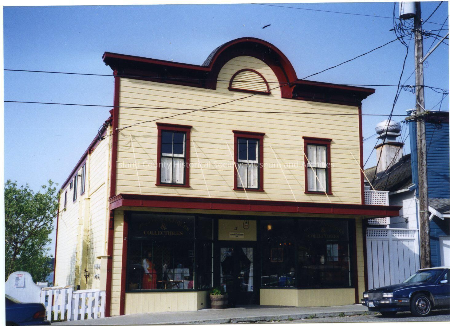 Photo of the building at 12 NW Front Street, built in 1886. In 1889 it was Blowers and Kineth general store: "Coupeville Cash Store". In 1952 a pharmacy, the antique shop and now a gift shop and yarn shop with restaurant below ground level. It had been a storage area, candle shop nd then espresso bar. Pale cream paint, rounded center to false front, large windows on either side of the door.