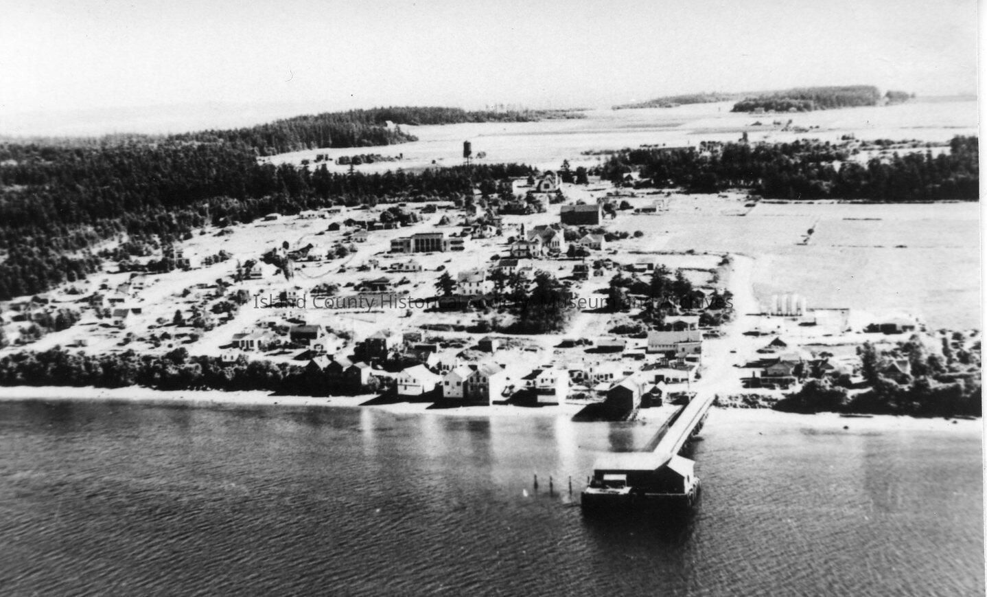 An aerial view of Coupeville looking from Penn Cove from the north to south.. A view of the Coupeville wharf and surrounding buildings. View of water tower situated where Whidbey General currently stands. Large amount of forested land in this photograph which suggests that this photo was possibly taken in 1950 or 1960. Gray scale photo.