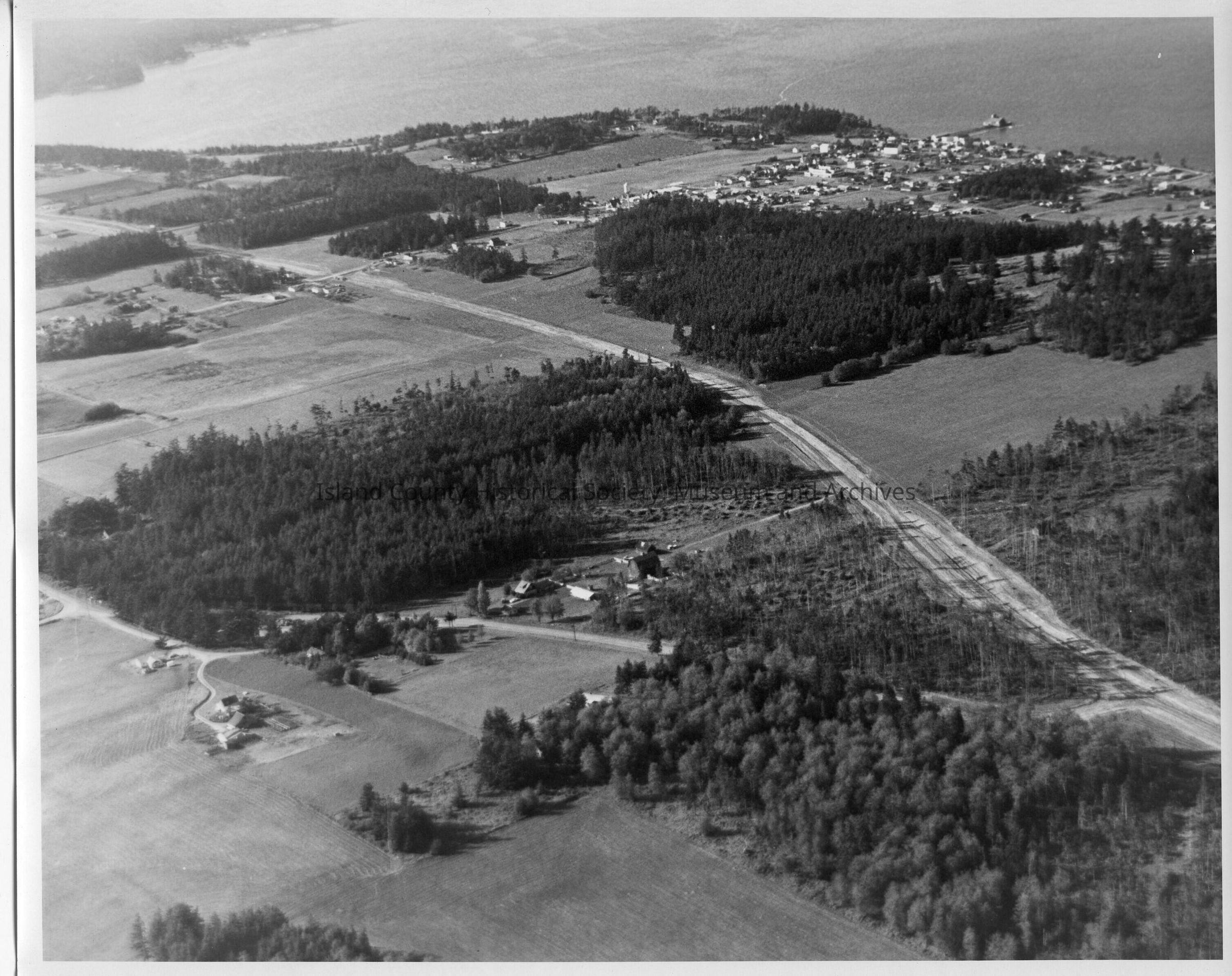 Aerial overview Coupeville southeast to northwest. Highway 20 in center. Wharf visible upper right of the photograph. Showing Terry road.