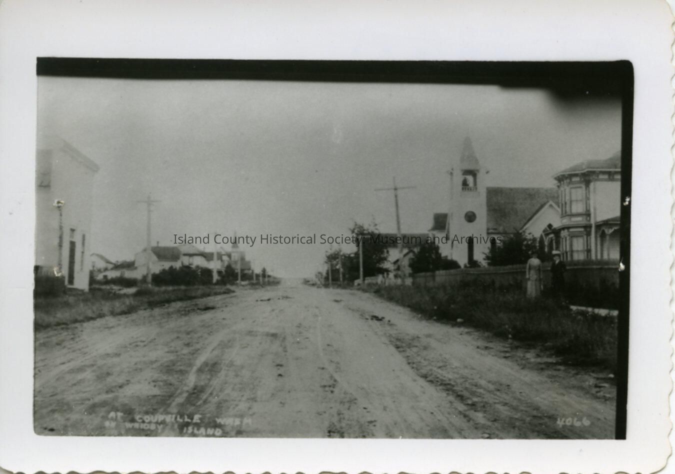 Photograph has view of the Coupeville Methodist Church - right hand side. The Women's Christian Temperance Union Hall building is located on the left side of the photo. The Congregational Church on the hill to the left. Unpaved roads in this picture. Gray scale photo. Also shows a few homes that surrounds the Methodist and Congregational Church.