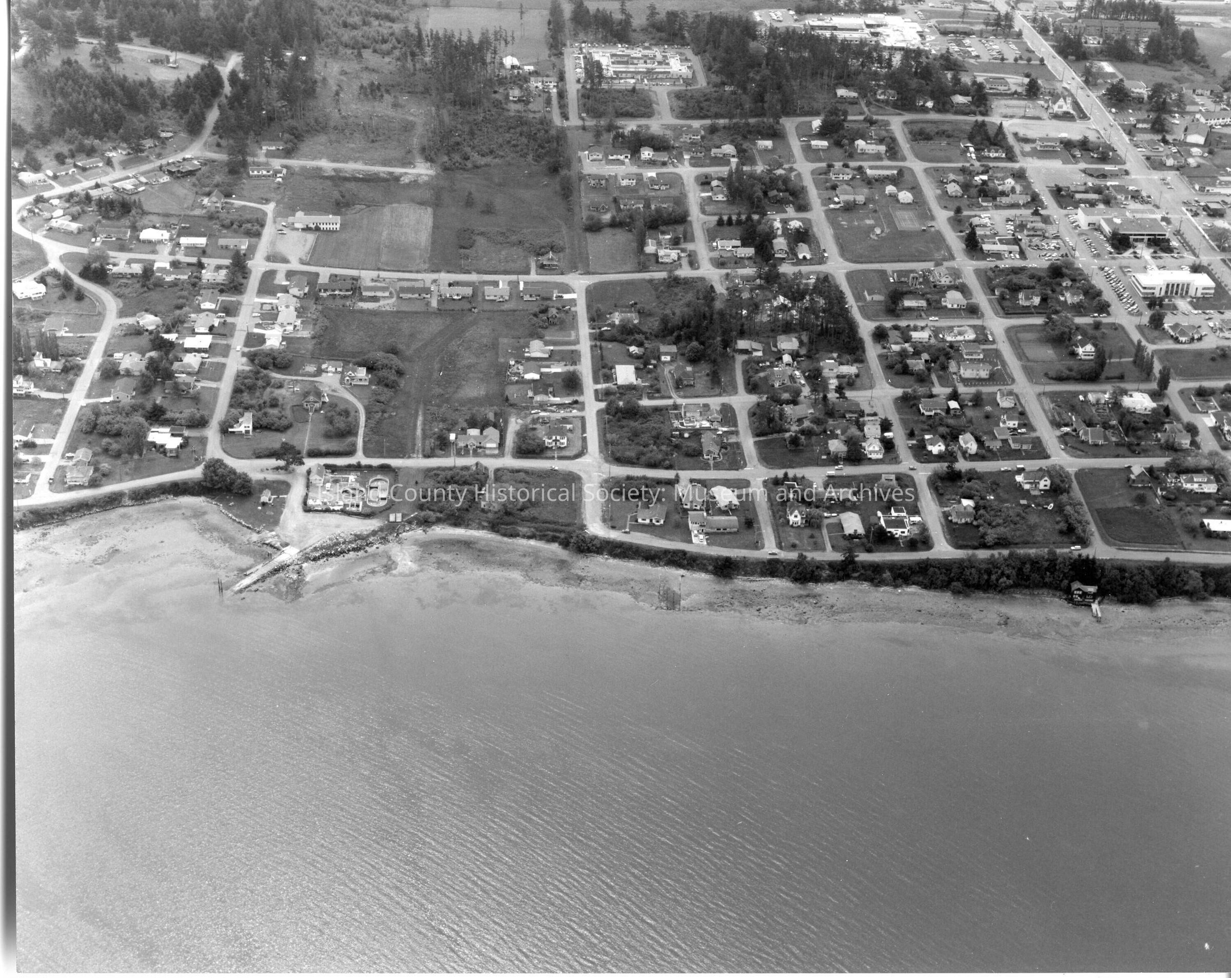 Aerial view of east side of Coupeville buildings/homes. Views of boat launch, Captain Coupe park, Captain Coupe's home and the sewage plant. Full view of east side of Penn Cove beach.