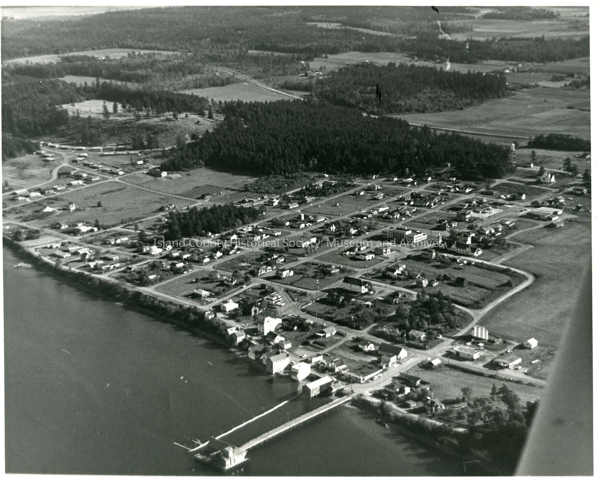 Aerial view of west side of Coupeville wharf with grainery tower. View of Coupeville town park and all homes and businesses along Coveland Rd and Broadway. View of the west side of beach along Penn Cove. Also contains an aerial view of ICHS and all surrounding buildings.