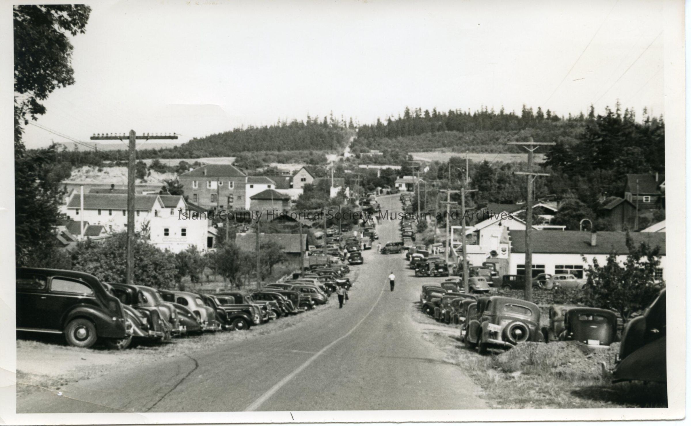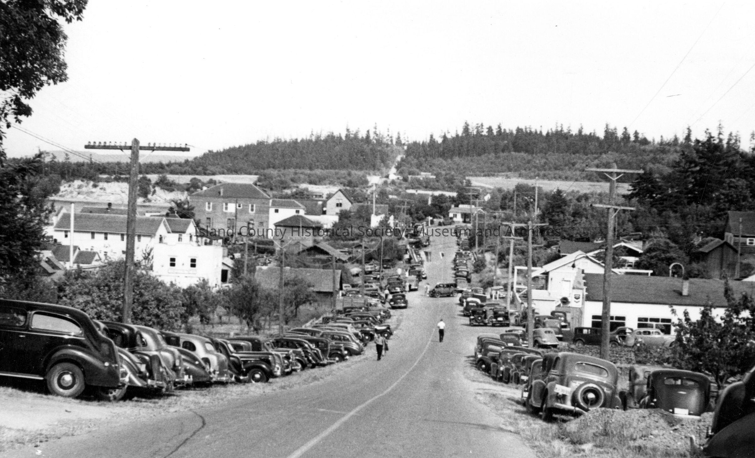 Coveland St. looking East in Coupeville probably at Festive time 1930's. A row of cars are lining the road. On the right side of the picture the first building in the photograph is the Pontiac Dealership/Auto Barn. Paved roads and the automobiles lining the street are from the 1930s.