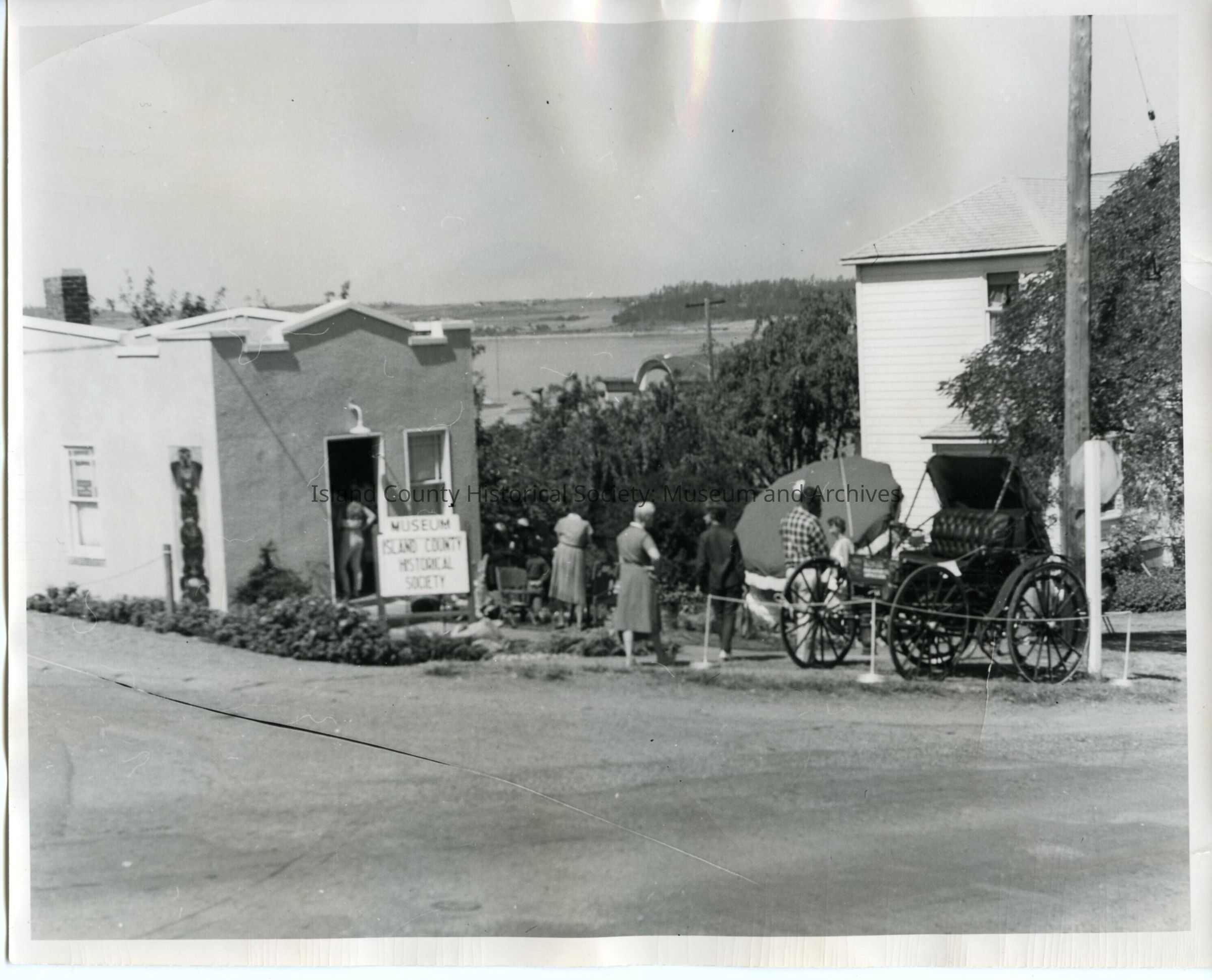 In this photo the old Telephone Exhange building has been converted in the Island County Historical Society. The right side of the picture is the Glenwood Hotel which was buildt in 1889. You can also see a glimpse of Penn Cove in this photograph. The first car on Whidbey Island is also featured in this portrait. There are a few people that have come to visit the Island County Historical Society museum. Gray scale portrait.