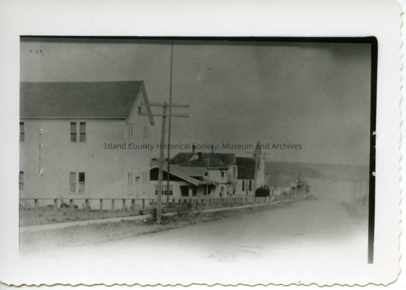 Photo of Coupeville main street looking north. On the left side of the photo first structure is the IOOF Hall. Further down center-left is the Methodist Church and a slight view of the Masonic Temple. Telephone poles line the road and the roads are unpaved.
