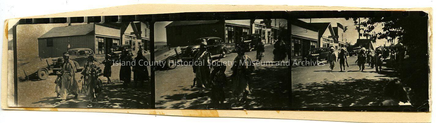 Native American men, women and children walking along probably Front Street. They are wearing dresses or trousers, blankets, feathered headresses, and other items. There are cars and a trailer.