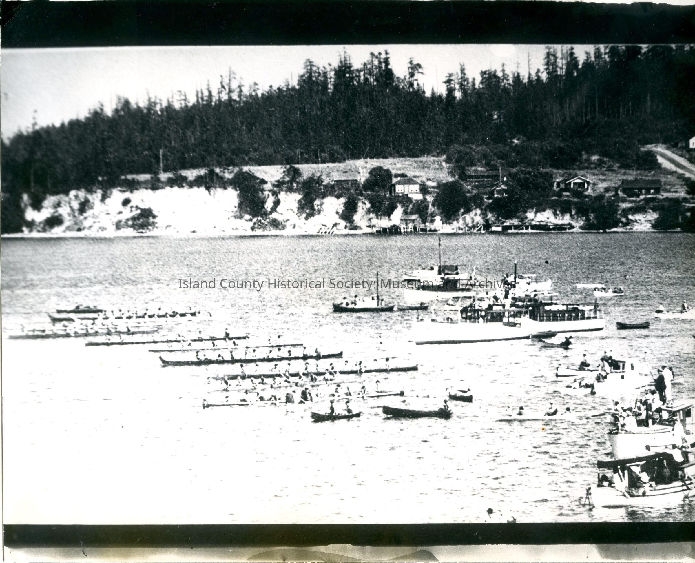 Native American canoes and paddlers at the 1931 Coupeville Water Festival. At least 11 canoes, with 11 men each, are in the water. There are steamships, sloops and other boats alongside the canoes. Written on the back: "1931 Indian War Canoe"Collection