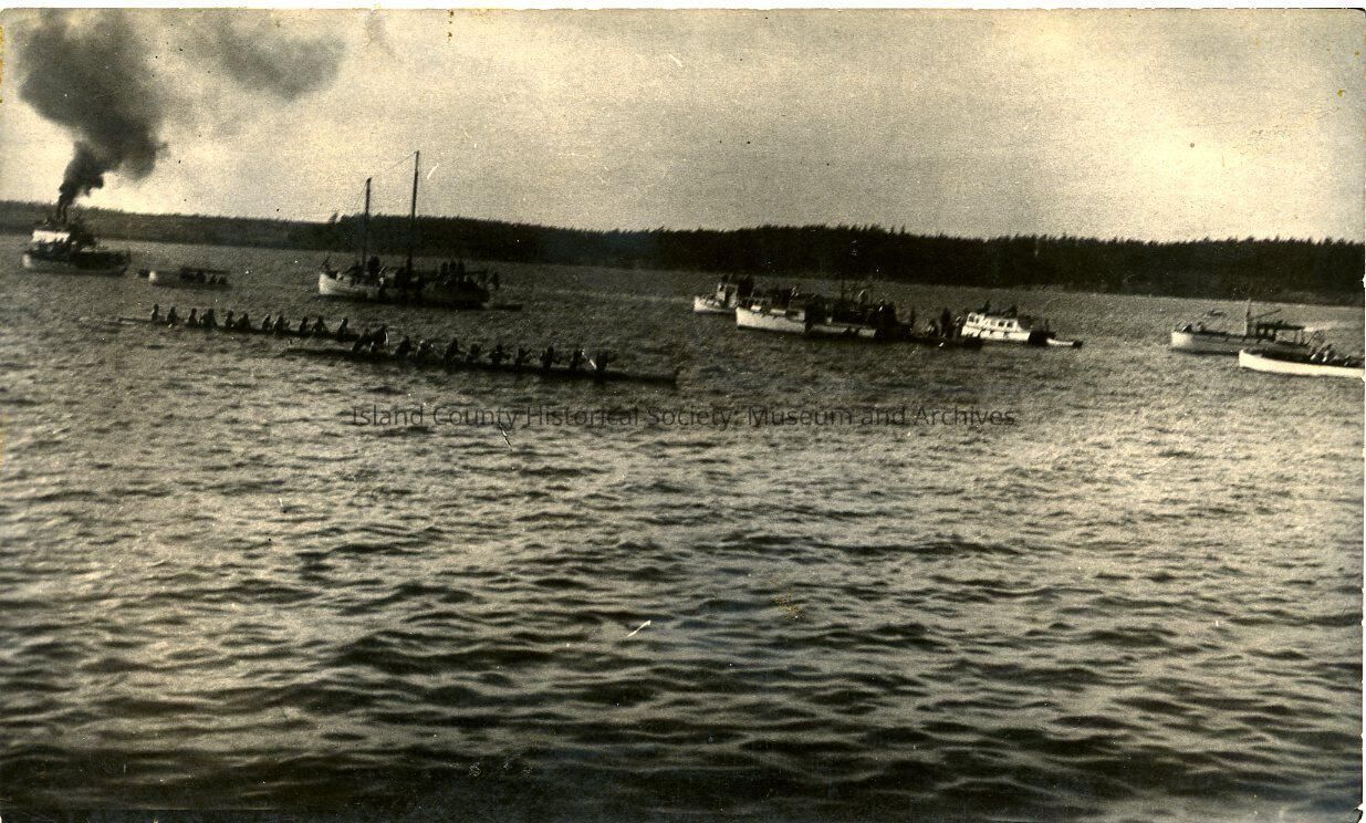 Native American Coupeville Water Festival. At least 2 canoes with 11 men. The photo is very dark. Various boats are next to the racing canoes. On the left in the rear is a steamer belching dark smoke.