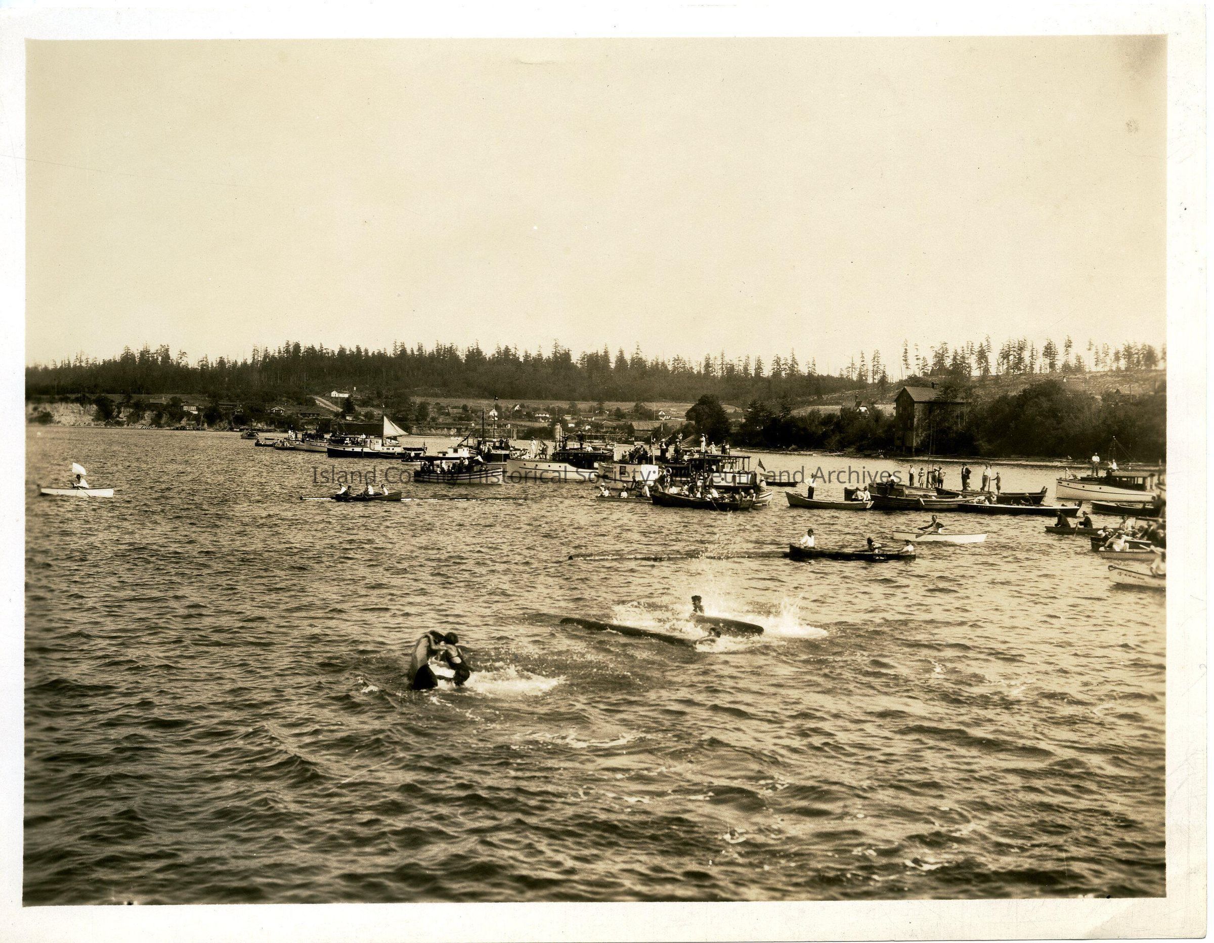 Native American Coupeville Water Festival. Smaller racing canoes - three - with 1 person each - they are tipping over the canoe and getting back in. There are other boats, rowboats, other canoes and steamships beyond the racing canoe. In the background is the Lovejoy boat making building and sawmill. Also visible is the top of the Clapp house. On the back: "Tip over race"