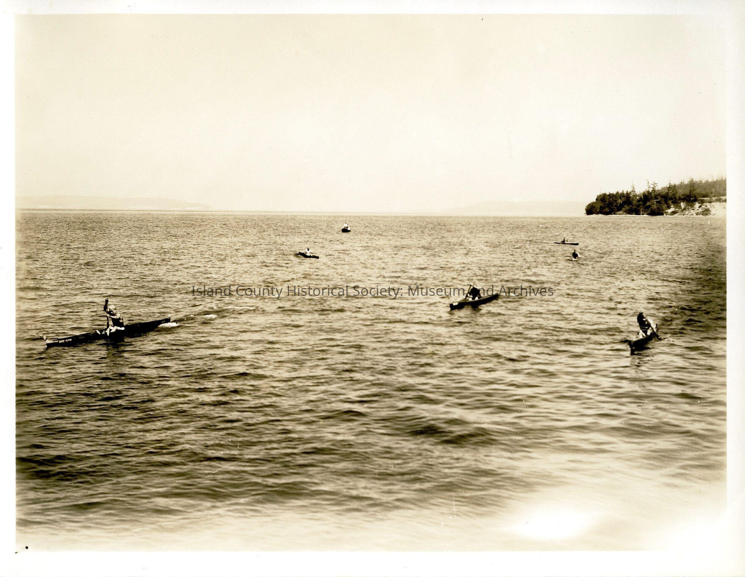Native American Coupeville Water Festival. Smaller racing canoes - at least 6 - with 1 man each. There is a probable rowboat in the background. On the back: "Finish of one-man canoe race"