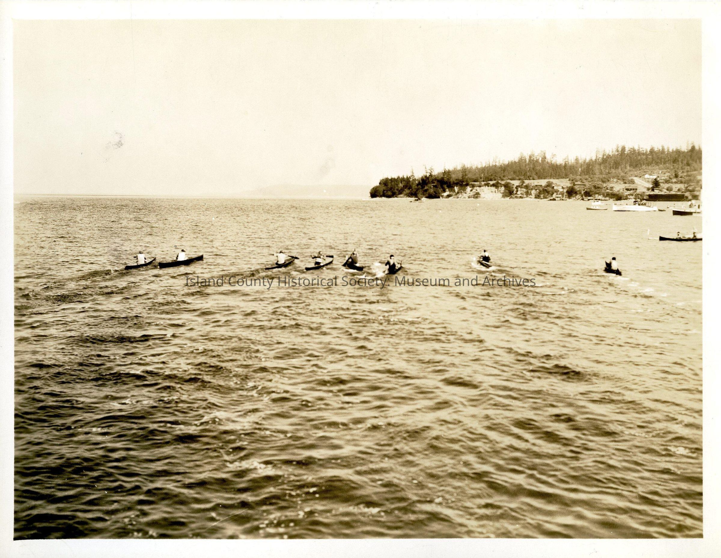 Native American Coupeville Water Festival. Smaller racing canoes - at least 6 - with 1 man each. There is a rowboat and larger boats in the background. On the back: "Coupeville Indian Festival races. Single races about 1938. Start of 1-man canoe races."
