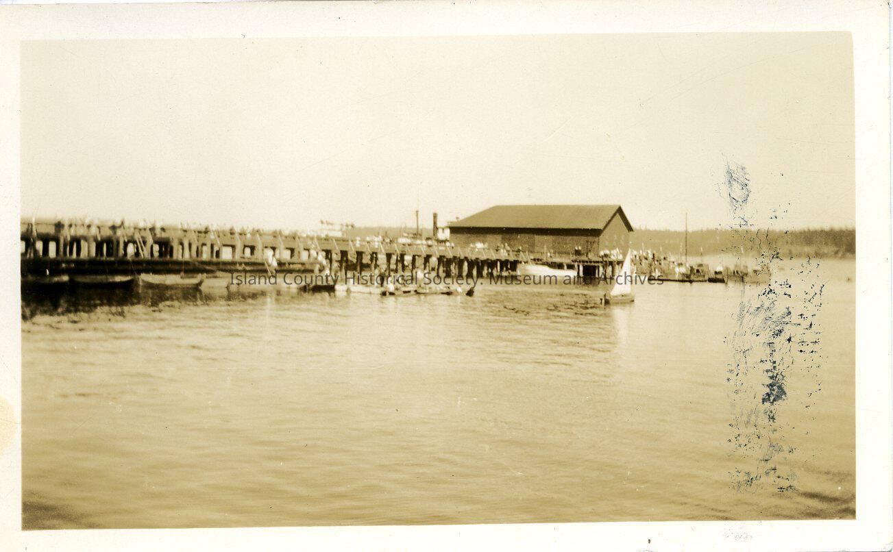 Native American Coupeville Water Festival. View from shore looking towards the wharf - a number of people on the wharf. Canoes tied up to the wharf. Boats of all types tied up or milling about the end of the wharf. Small sailboat in front of the them. Behind wharf looks like a large steamship.