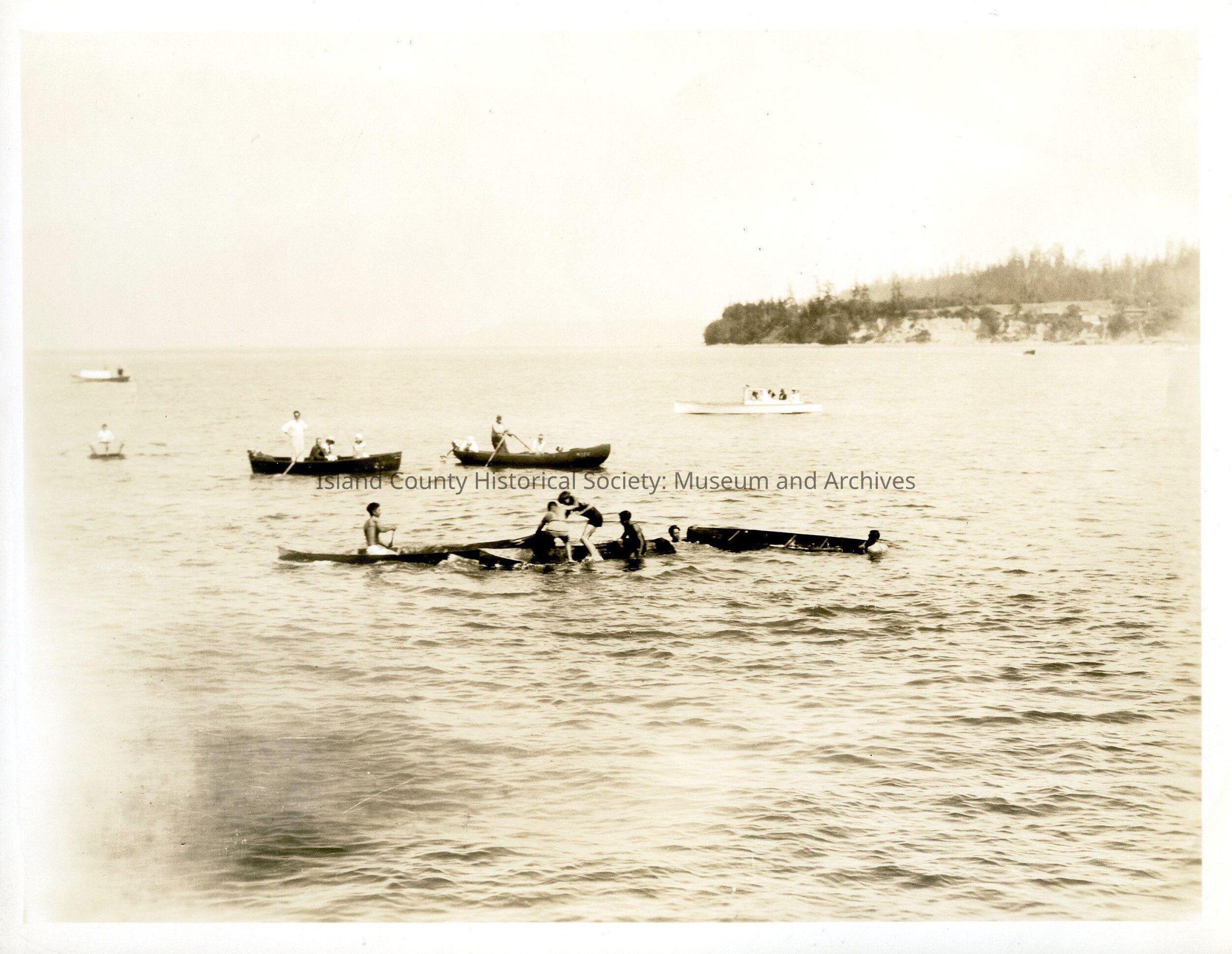 Native American Coupeville Water Festival. Smaller racing canoes - at least 3 - with 2 men each. One man is still in his canoe, the others are in the water, partially in or out of canoes or trying to tip the canoe upright. There are rowboats and other small boats in the background. On the back: "Push over race"