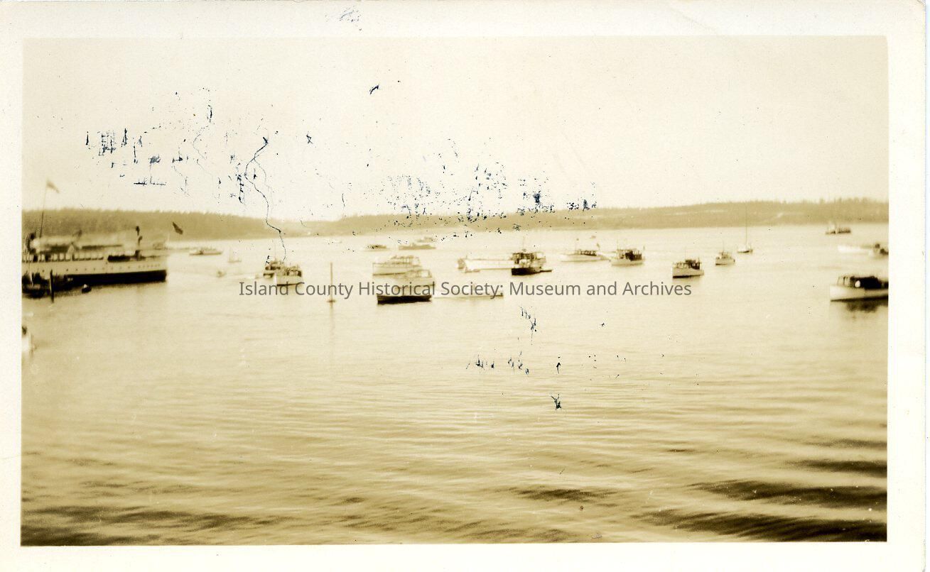 Native American Coupeville Water Festival. A number of boats on calm water, to include small motor boats and a large steamship.