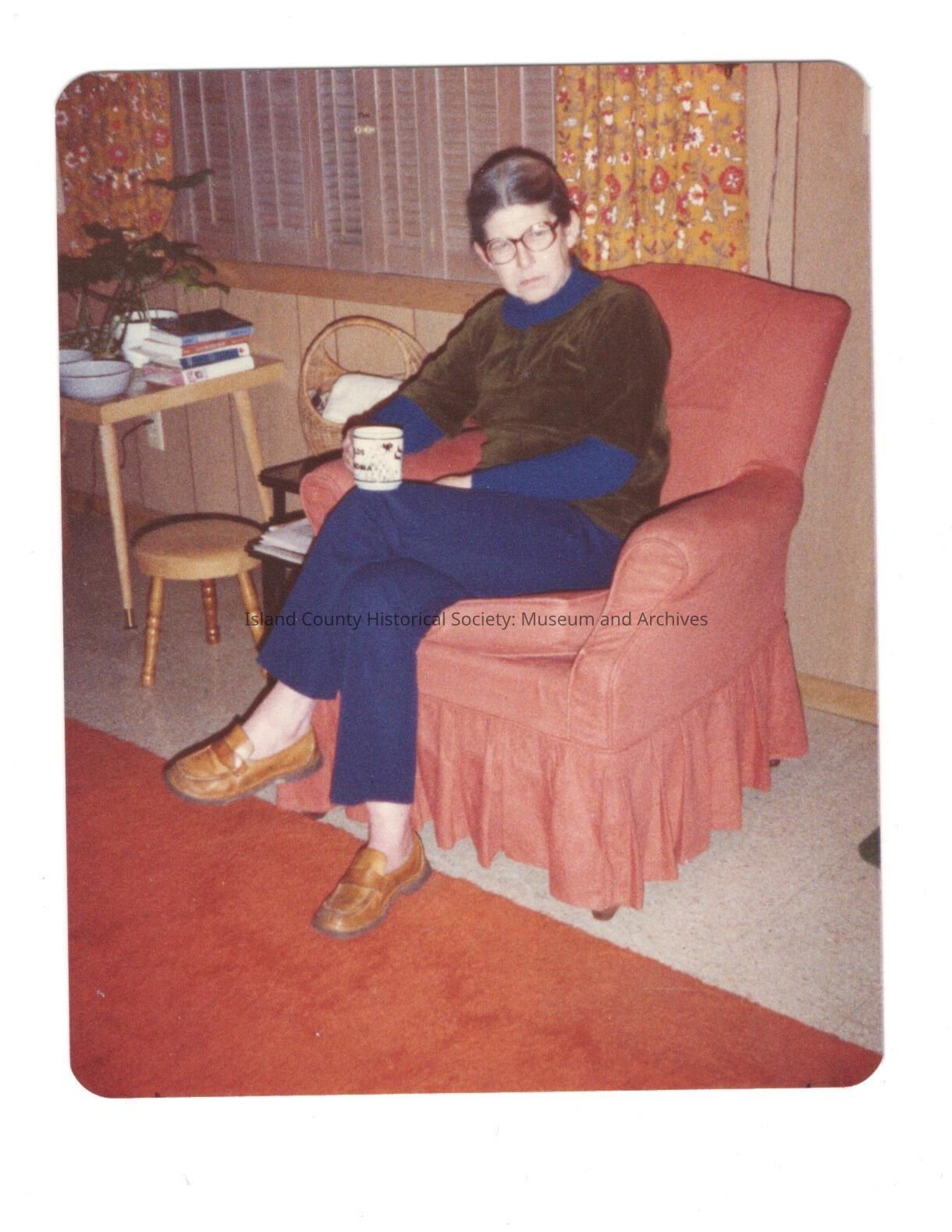 This is a photo of Jimmie Jean Cook at Brook's house. Photo is dated circa 1970s. In the photo Jimmy Jean is sitting in a lounge chair holding a cup of coffee. Color photo.