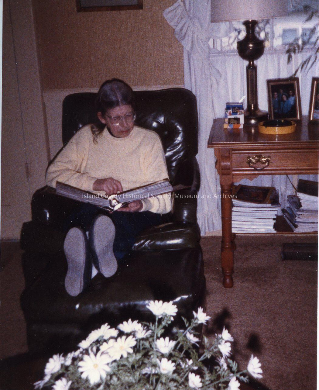 This is a photo of Jimmie Jean Cook at Brook's house circa 1980. In the photo Jimmie Jean is sitting in a recliner holding a book, possibly a photo album. Other items in the photo are a side table with a lamp and family photos. Color photograph.
