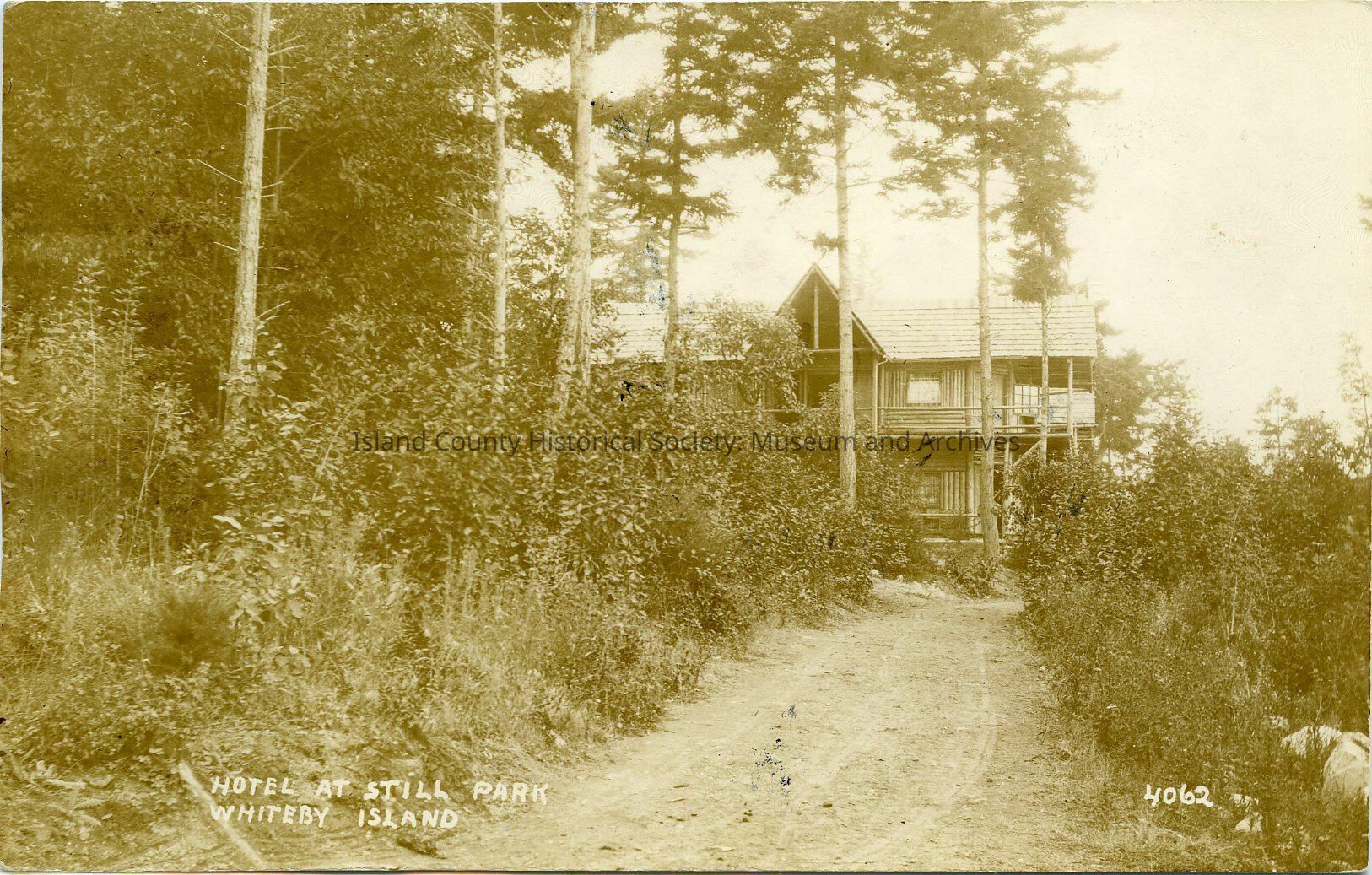 Caption at bottom reads "Hotel at Still Park Whiteby Island." The photographers number is "4062." This sepia toned postcard shows the Whid Isle Inn, now known as the Captain Whidbey Inn, at the end of a dirt road. Tall pines line one side of the road and Penn Cove is presumably to the right makint this the east side of the hotel.