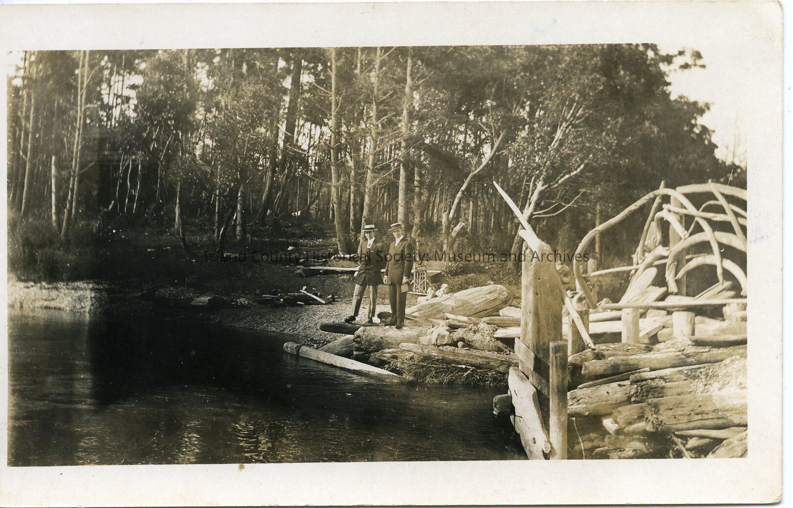 Two men in suits are standing at the edge of the swimming lagoon at Still's Park near the Whid-Isle Inn, now known as the Captain Whidbey Inn. The bridge at the opening of hte lagoon is seen on the right with its organic driftwood railings. The men are standing on driftwood with a gravel beach to the left. Woods take up the background.
