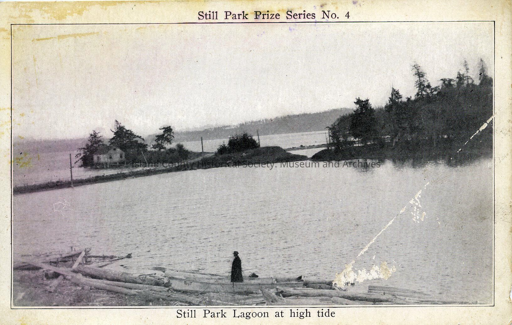 This photo shows the beach at Still Park. The captions read "Still Park Prize Series No. 4, Still Park Lagoon at high tide." The foreground is a rocky beach with piles of driftwood. A man is walking along the beach. Across the waters of the lagoon is an old mill store house. There are power or telephone poles along the road between the lagoon and Penn Cove.