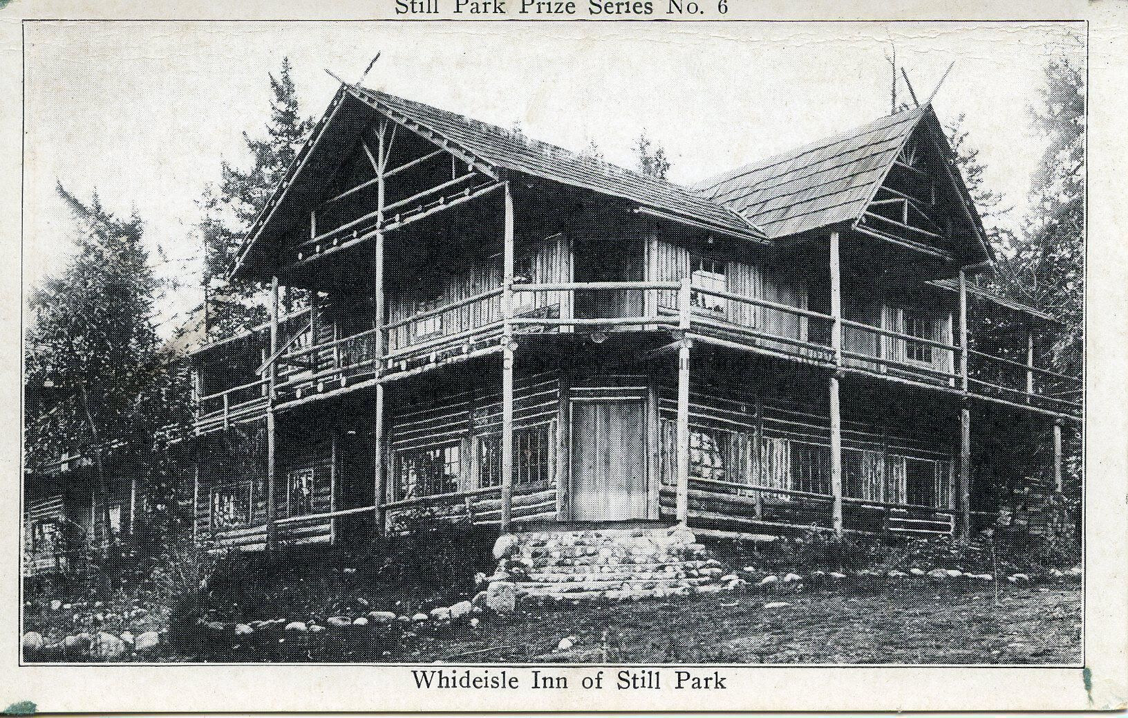 This photo shows the Whid Isle Inn from the northwest corner. The caption reads, "Still Park Prize Series No. 6, Whidisle Inn of Still Park." The Sno-Isle Inn, now known as the Captain Whidbey Inn is a two story log structure with two gables. There is a two story porch running the west and north side of the building. Stone steps lead from the first floor porch to the ground.