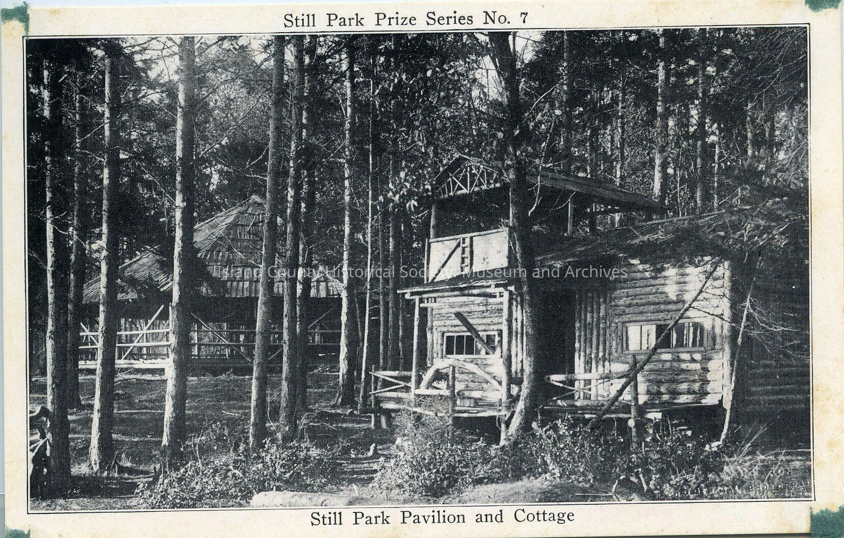 This photo shows the a park pavillion and a two story cottage in the woods. The caption reads, "Still Park Prize Series No. 7, Still Park Pavillion and Cottage." The cottage has a front awning over the front door. There is one window on either side of the door. The second story is made up of a porch and is only half the footprint of the first story.
