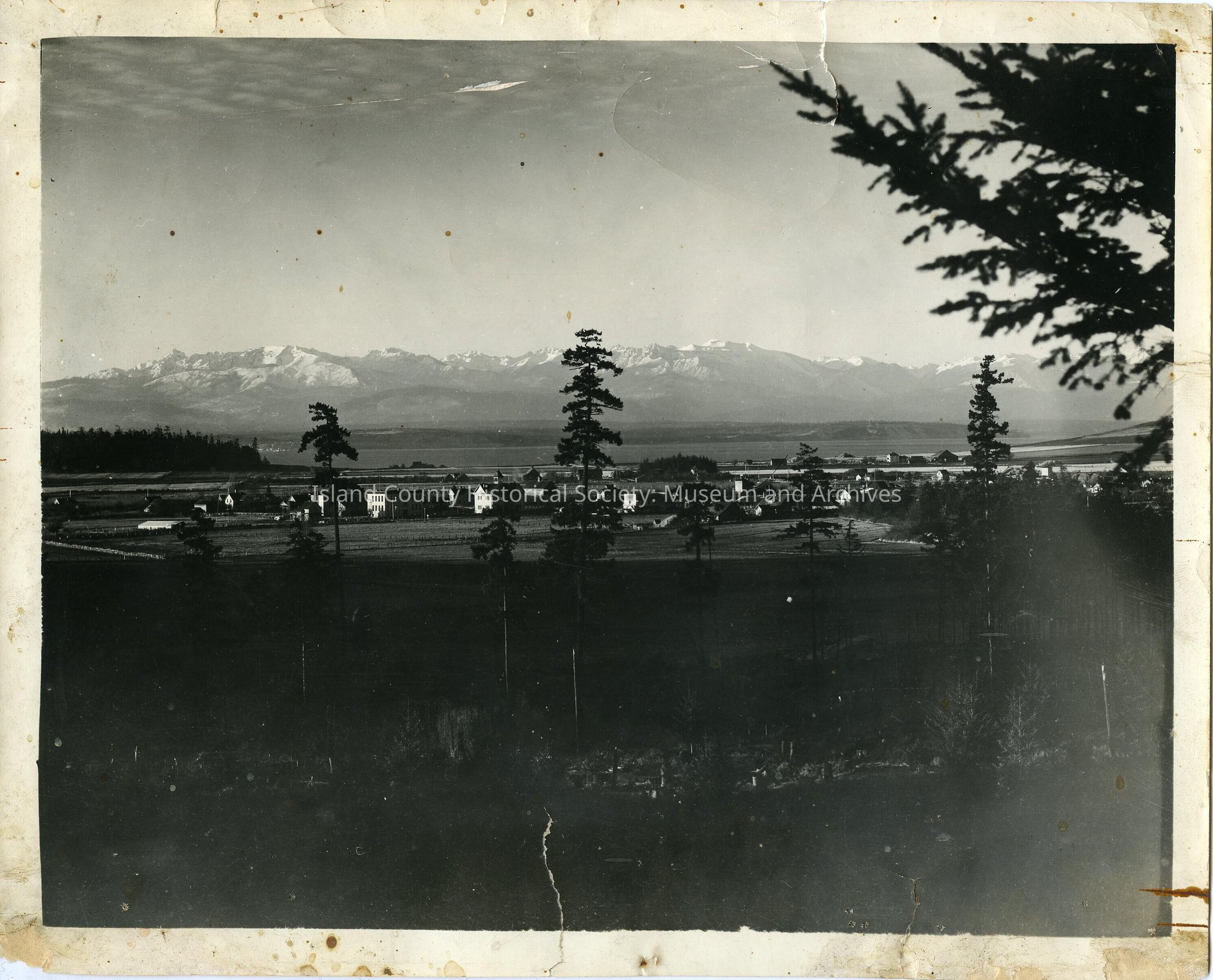It is a black and white photo of Ebeys prairie taken near Sunnyside cemetery. It has an overview of the mountains and has a lot of huge trees. Most of the houses look like thay are on farms. Also most of the the houses are white with flat roofs.