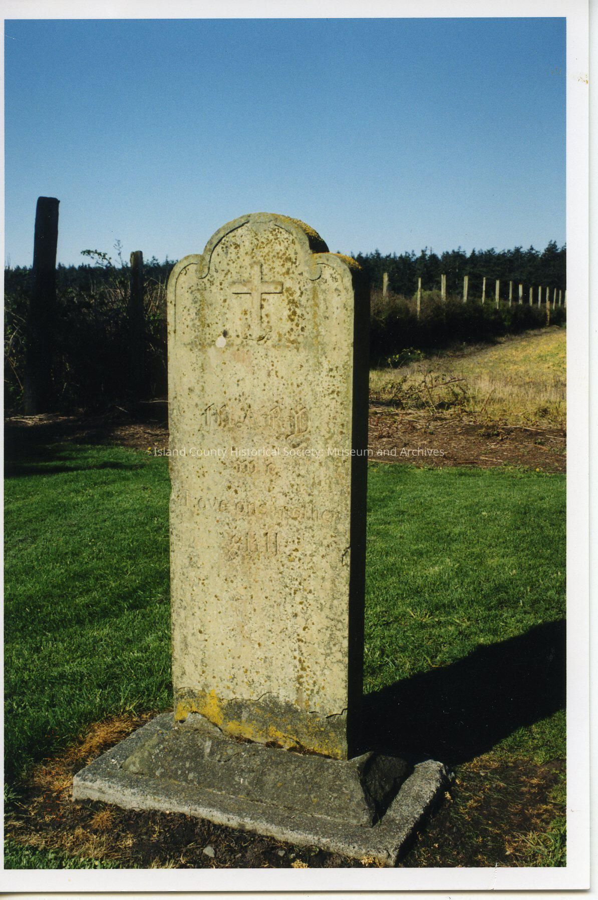 Photo at Sunnyside Cemetery of a gravestone. Engraved in the stone is at least "Mary" "Love one another". Perhaps a year of 1911. A cross is on the top. A fence and trees are in the background.