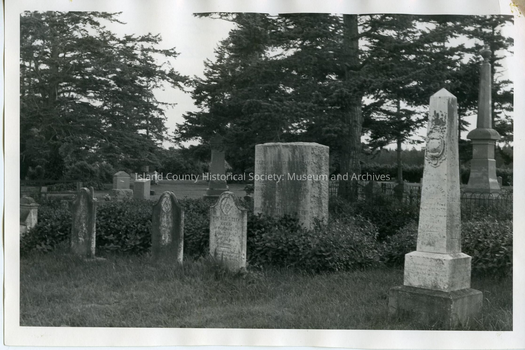 Photo at Sunnyside Cemetery of a set of in front of another set of gravestones in a plot with a low iron fence around it Trees surround the plot. One of the gravestones is tall with a long shaft and oblong ball on top. A gravestone on the near front is a conical shape with "Ebey" engraved. The low gravestone to the left is Winfield Ebey and the ones to the left of that are illegible. Two of the gravestones have probably the Mason's logo engraved at the top. On the back: Jacob Ebey's plot Sunnyside Cemetery.