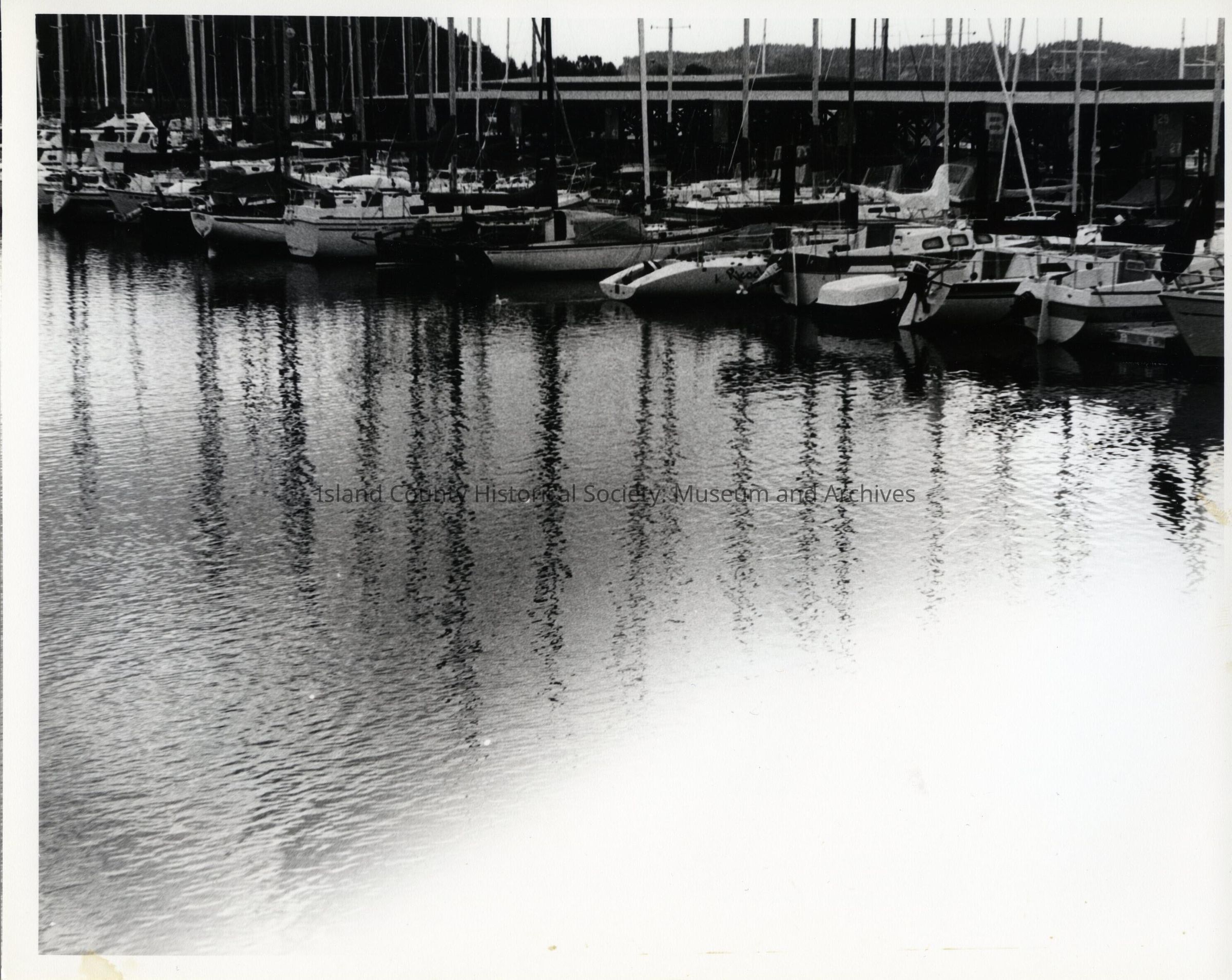 Black and white photo of the Oak Harbor marina. The back of the photo reads, "taken mid-1980's by Orville "Wes" Westlund." The lower right is overexposed. The reflections of he sailboat masts is seen in the center of the image.