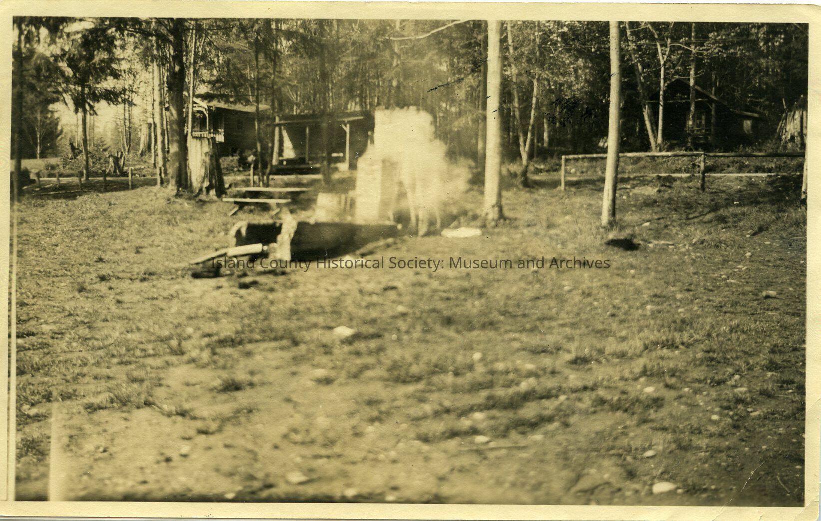 The photo shows the campground at Stills Park near the Whid-Isle Inn, now known as the Captain Whidbey Inn. In the background you can see a cabin in the park. In the foreground you have the picnic area. In the center of the picture is a white blur, whether smoke or steam from a fire, or the photographer obscuring a person. In front of the supposed smoke is a fire pit.Made/Created