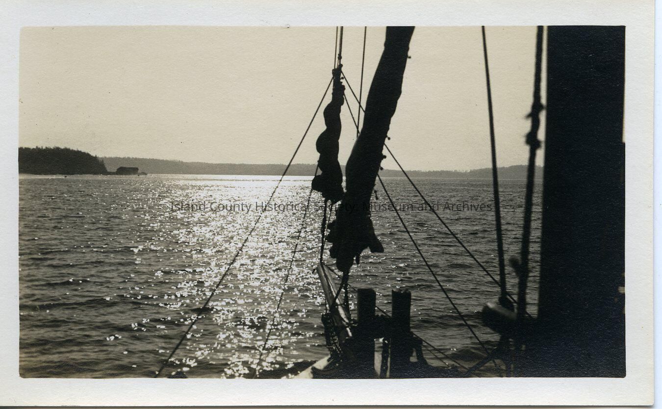 A photograph possibly taken in Penn Cove. It is taken near the bow of a sailing boat, but the viewer can see the bow and foresails of the boat. The Coupeville Wharf can be seen off to the left in the distance. The reflection of the sun on the water is central.