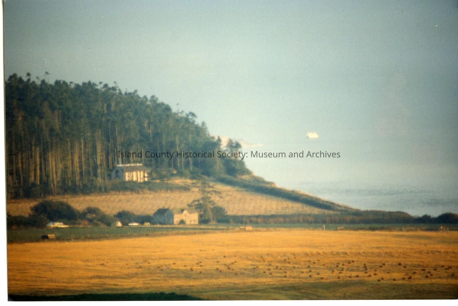 Picture showing Ebey's Ferry House with private residence in the background. Shows field with what appears to be a crop harvested in upper field.