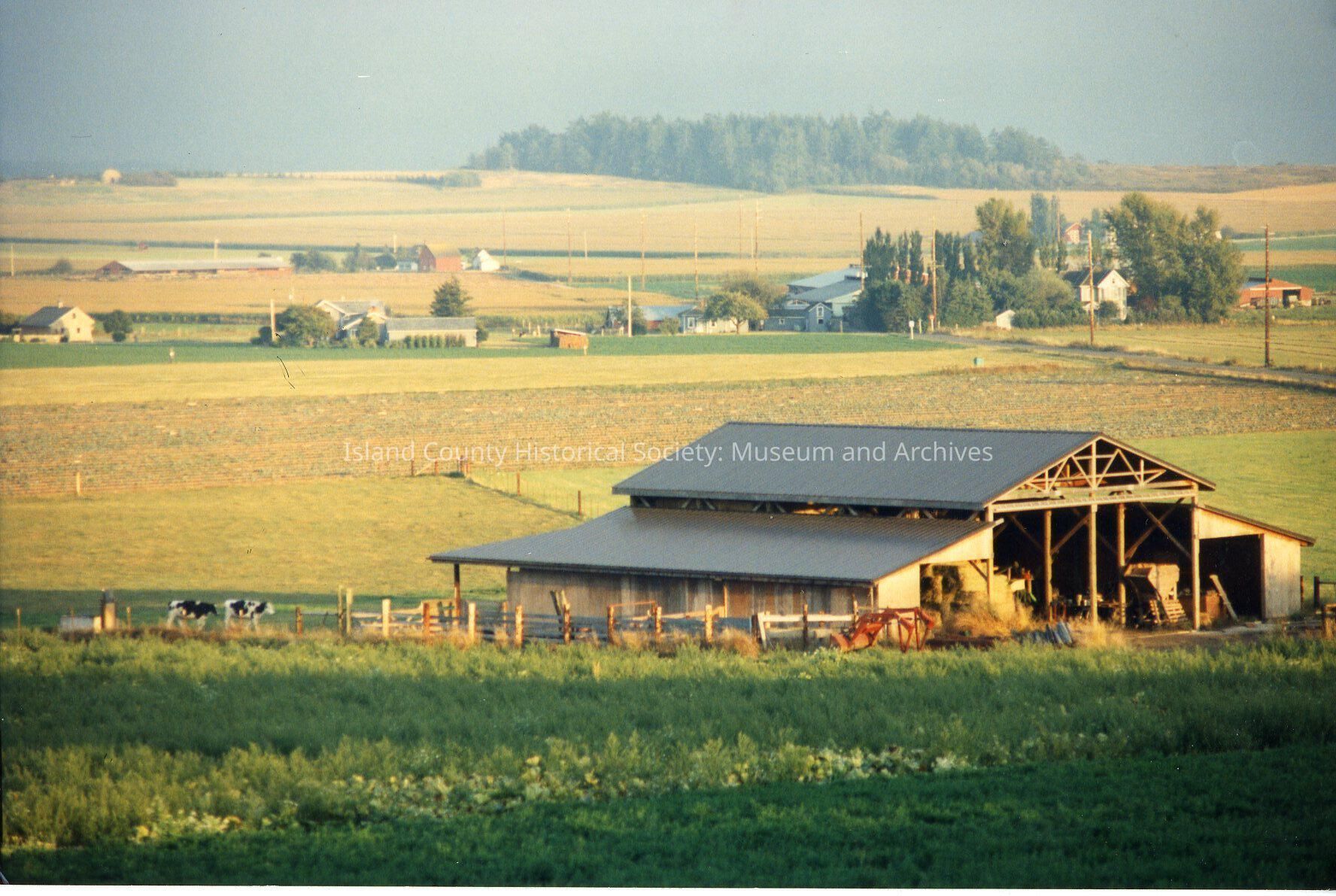 Dairy barn with dairy cows next to the barn. On the photo on the back is written "Smith Barn". But it is not the Smith Barn that is associated with the Smith Barn that burned in 2017. Photo also shows other barns (large red) and other farm houses throughout the prairie.